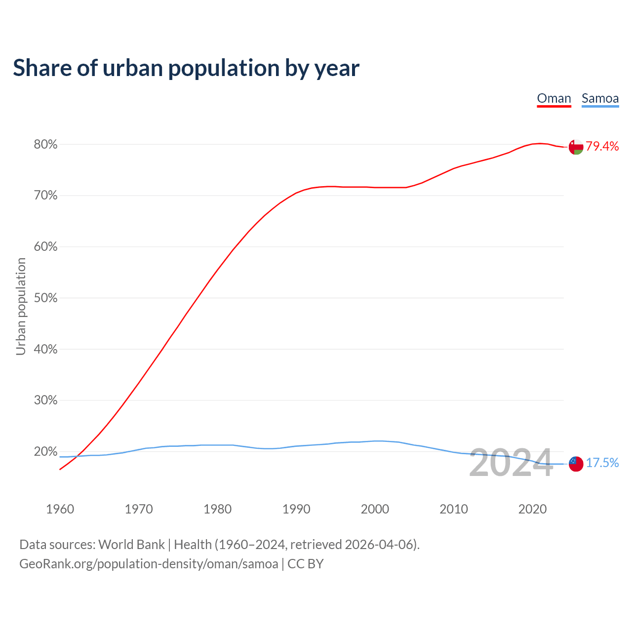 From 2004 to 2024, the share of urban population changed from 71.5% to 79.4% in Oman and from 21.5% to 17.5% in Samoa.