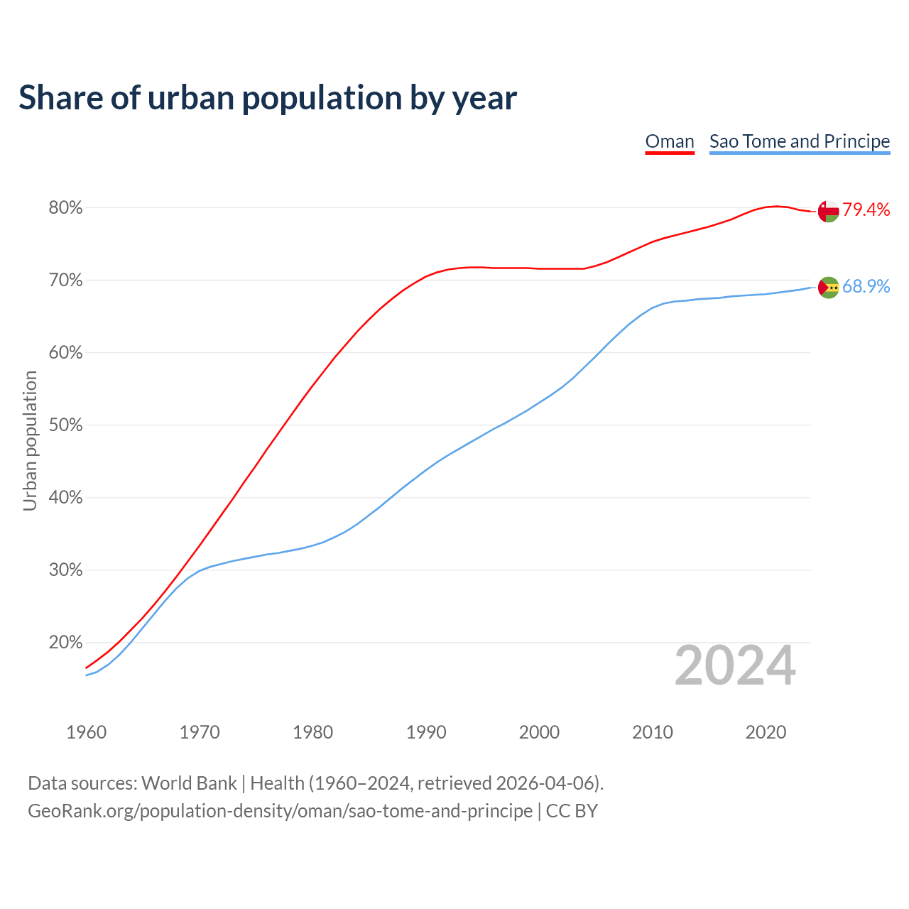From 2004 to 2024, the share of urban population changed from 71.5% to 79.4% in Oman and from 57.9% to 68.9% in Sao Tome and Principe.