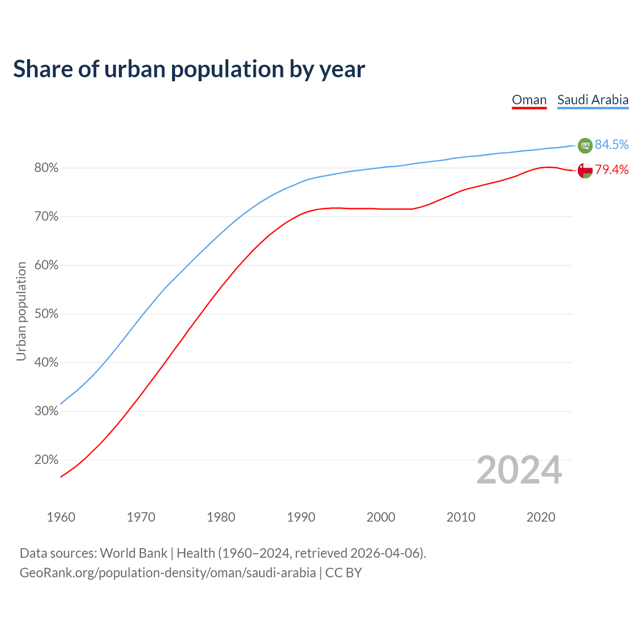 From 2004 to 2024, the share of urban population changed from 71.5% to 79.4% in Oman and from 80.8% to 84.5% in Saudi Arabia.