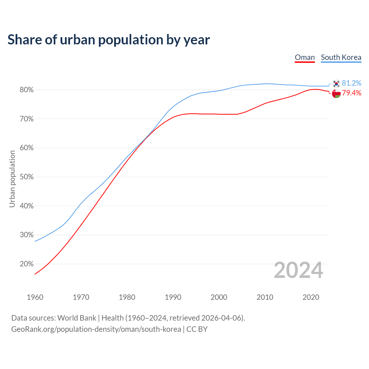 From 2004 to 2024, the share of urban population changed from 71.5% to 79.4% in Oman and from 81.1% to 81.2% in South Korea.