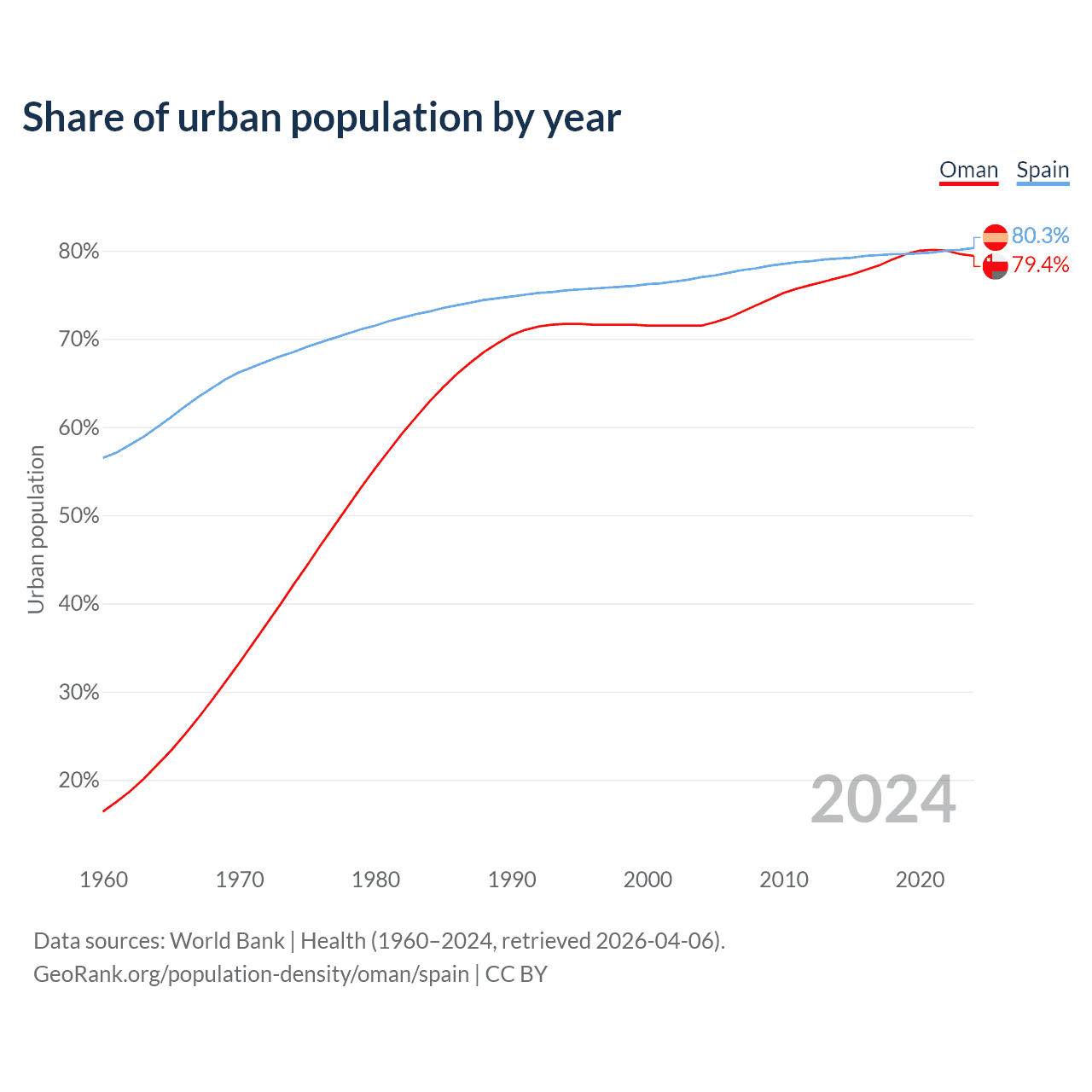 From 2004 to 2024, the share of urban population changed from 71.5% to 79.4% in Oman and from 77% to 80.3% in Spain.