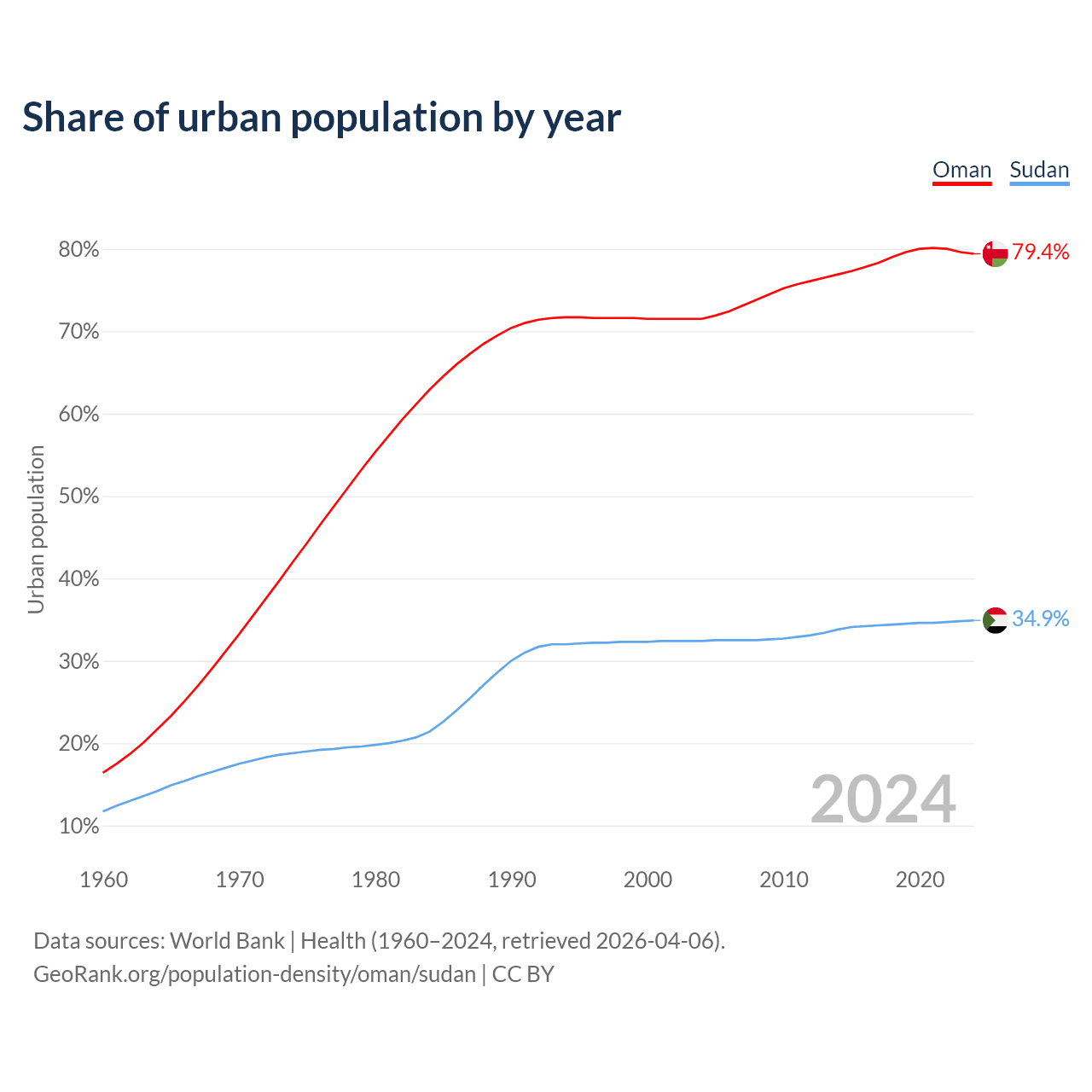 From 2004 to 2024, the share of urban population changed from 71.5% to 79.4% in Oman and from 32.4% to 34.9% in Sudan.
