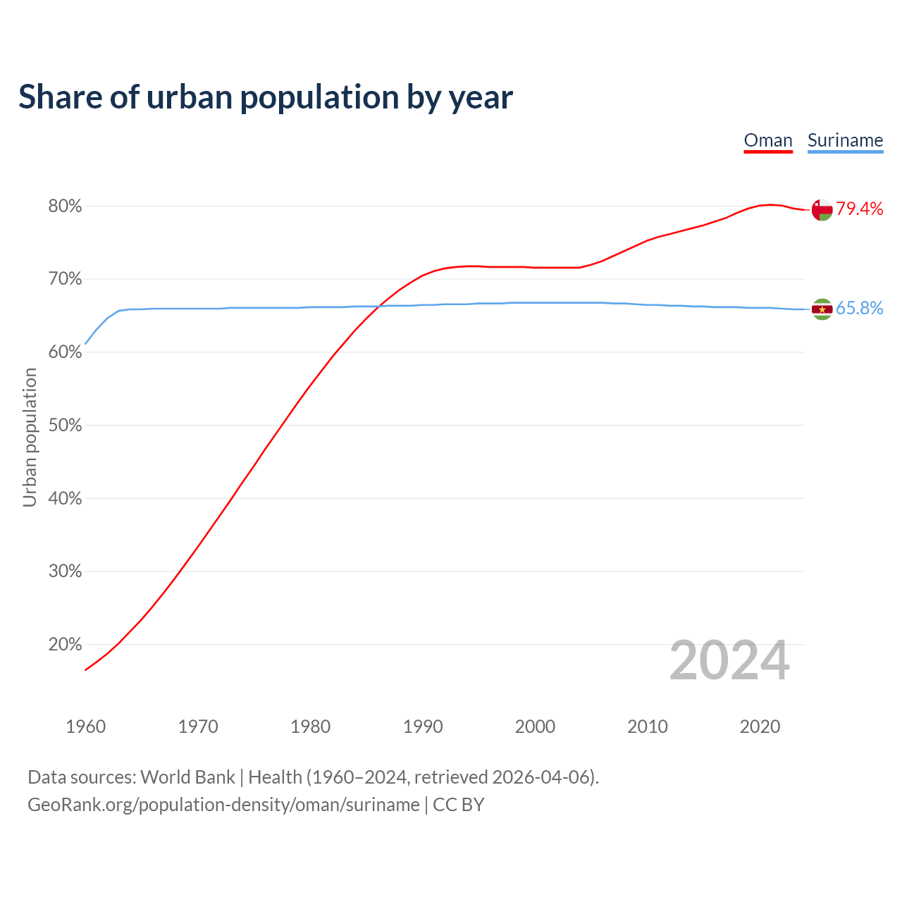From 2004 to 2024, the share of urban population changed from 71.5% to 79.4% in Oman and from 66.7% to 65.8% in Suriname.