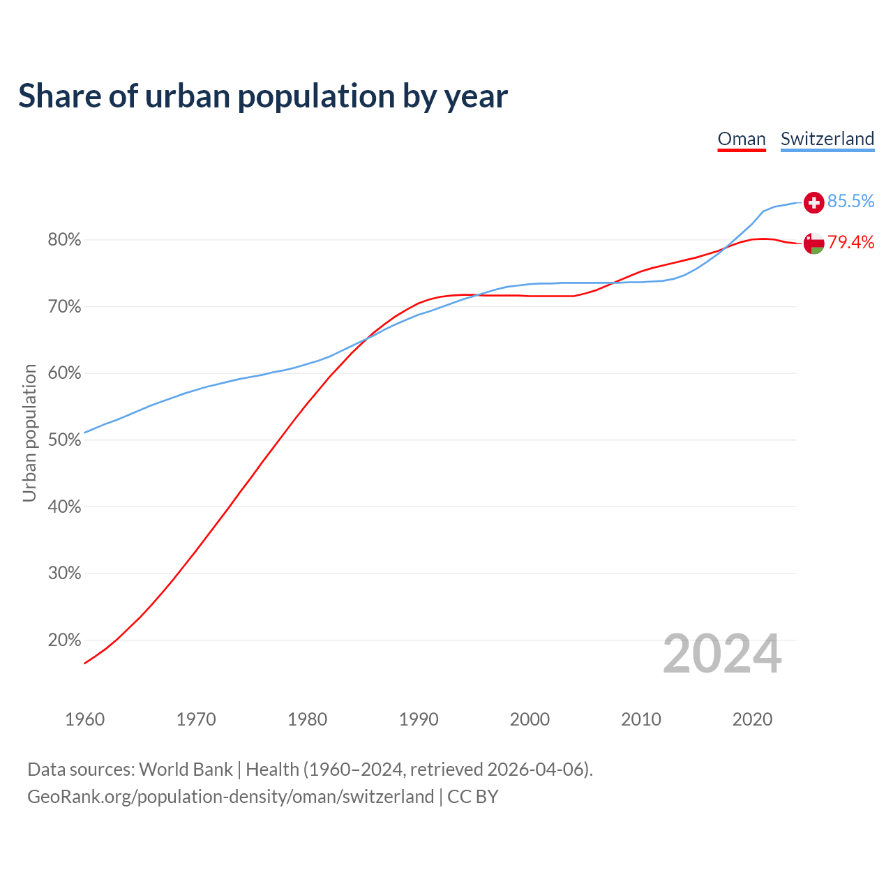 From 2004 to 2024, the share of urban population changed from 71.5% to 79.4% in Oman and from 73.5% to 85.5% in Switzerland.