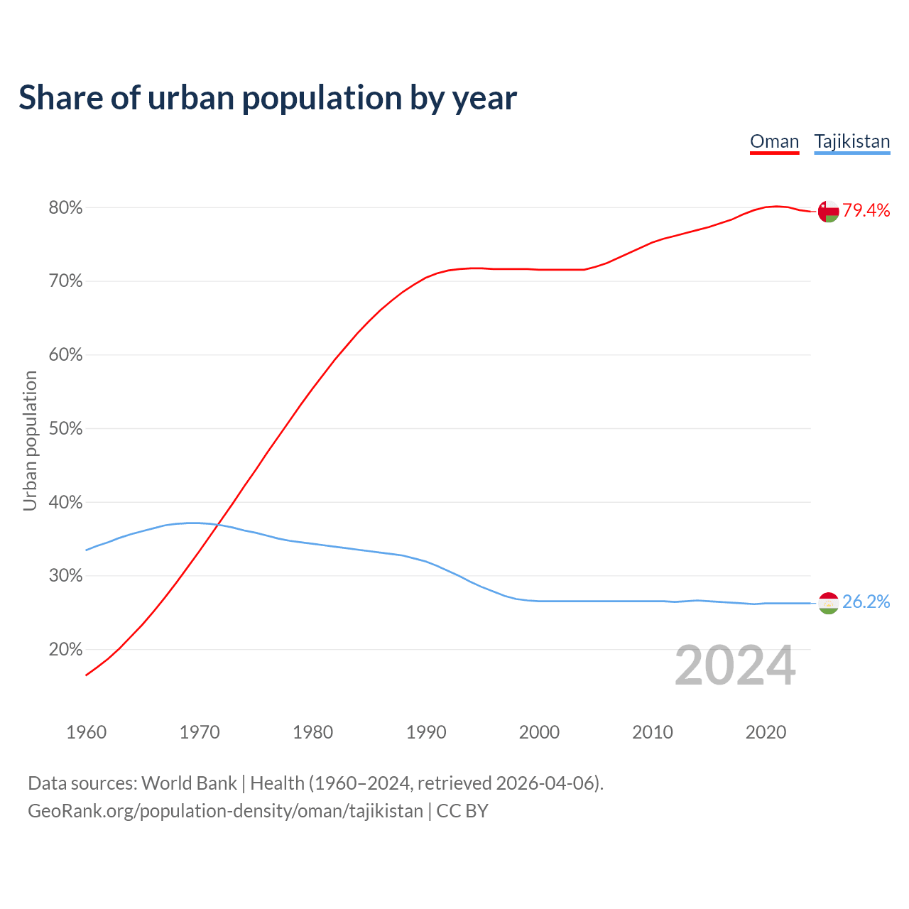 From 2004 to 2024, the share of urban population changed from 71.5% to 79.4% in Oman and from 26.5% to 26.2% in Tajikistan.