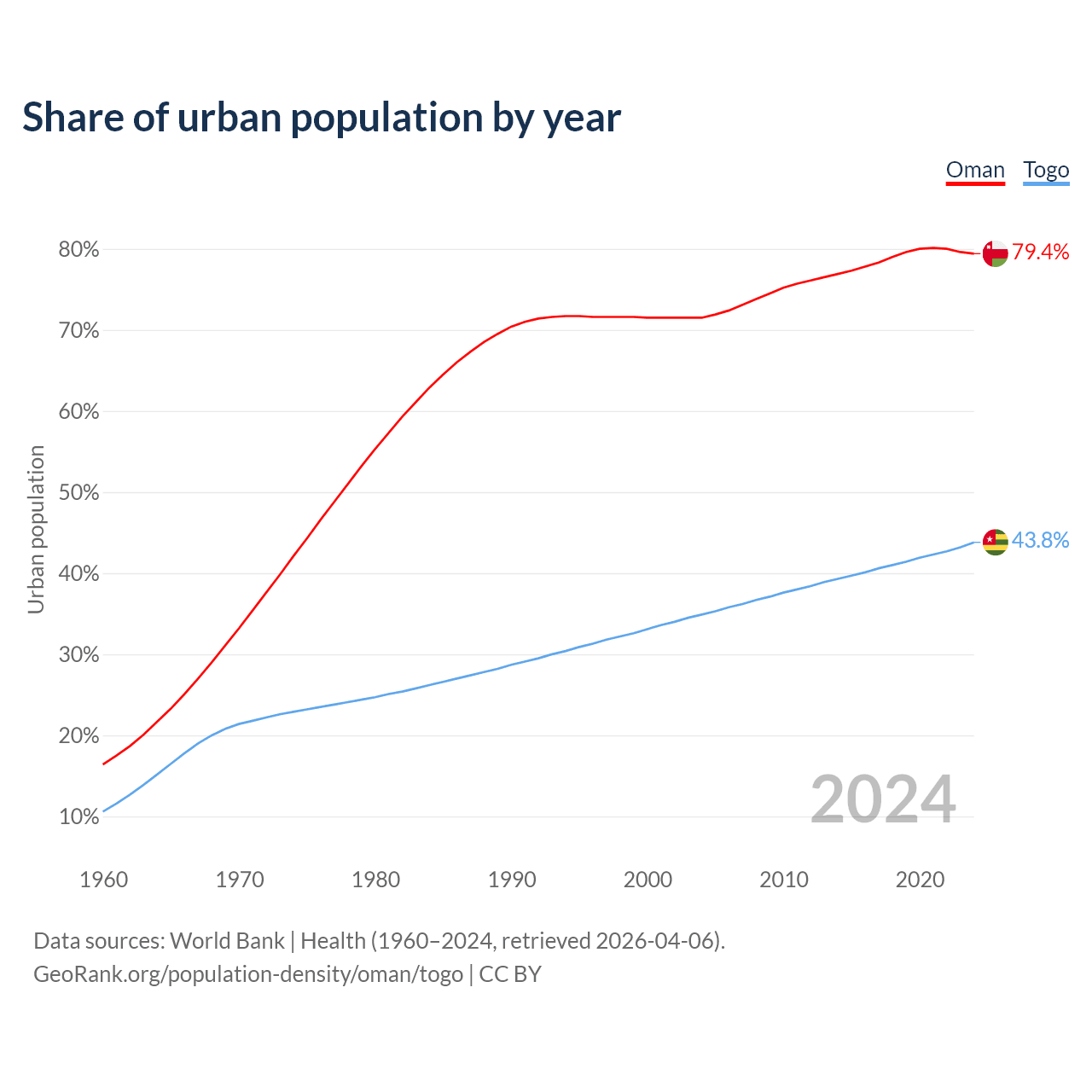From 2004 to 2024, the share of urban population changed from 71.5% to 79.4% in Oman and from 34.9% to 43.8% in Togo.