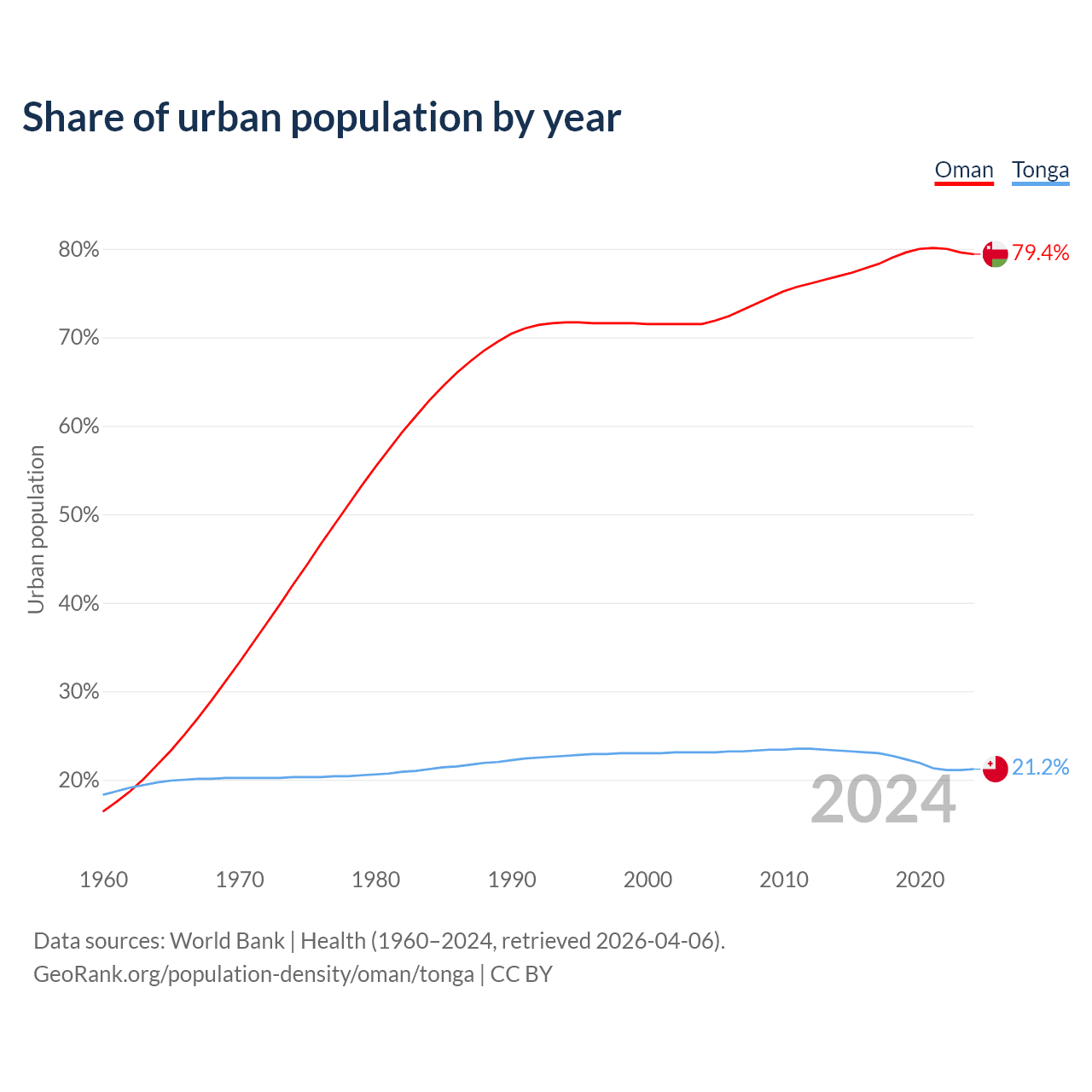 From 2004 to 2024, the share of urban population changed from 71.5% to 79.4% in Oman and from 23.1% to 21.2% in Tonga.