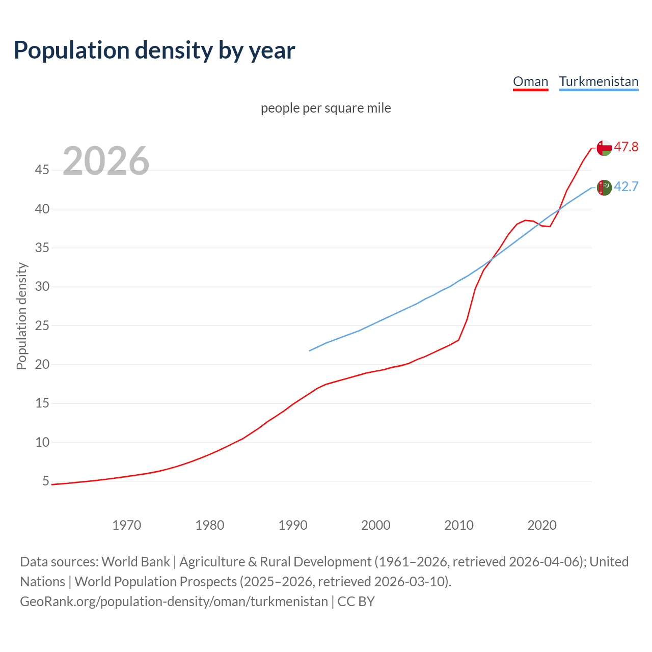 From 2006 to 2026, population density in Oman increased by 127.4%, compared to a 50.5% growth in Turkmenistan.