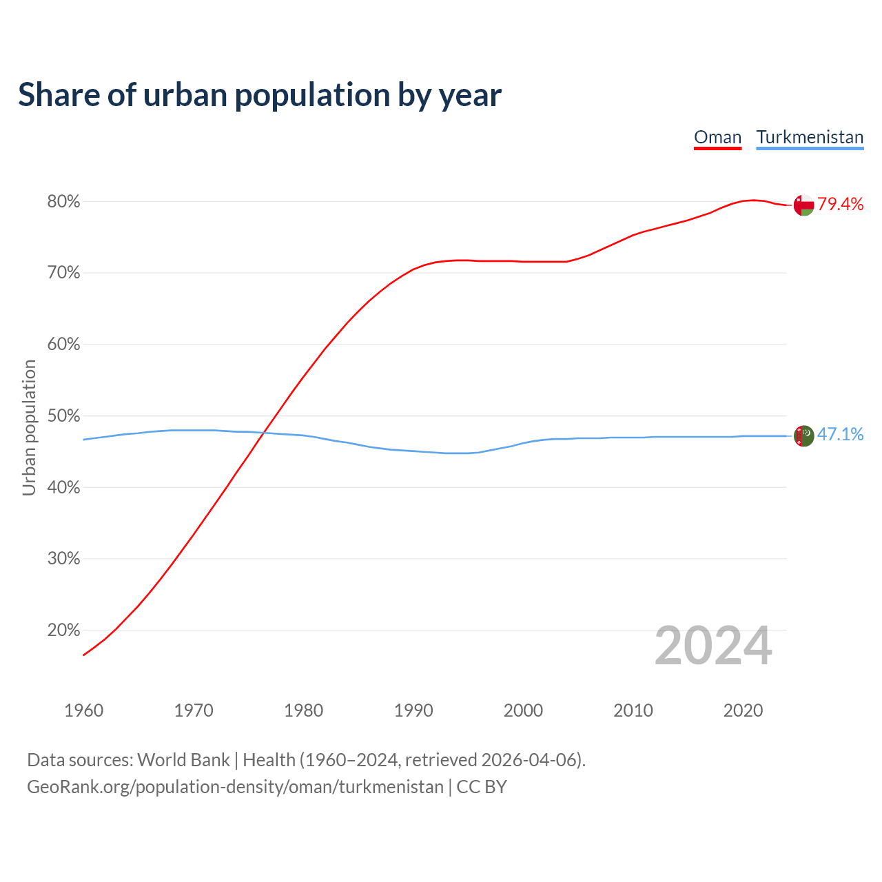 From 2004 to 2024, the share of urban population changed from 71.5% to 79.4% in Oman and from 46.7% to 47.1% in Turkmenistan.