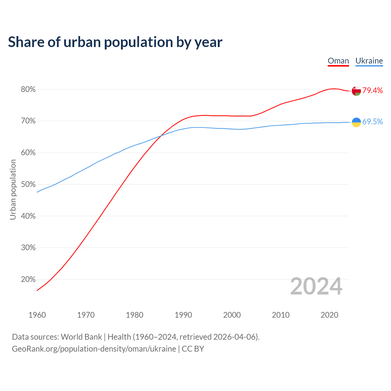 From 2004 to 2024, the share of urban population changed from 71.5% to 79.4% in Oman and from 67.6% to 69.5% in Ukraine.