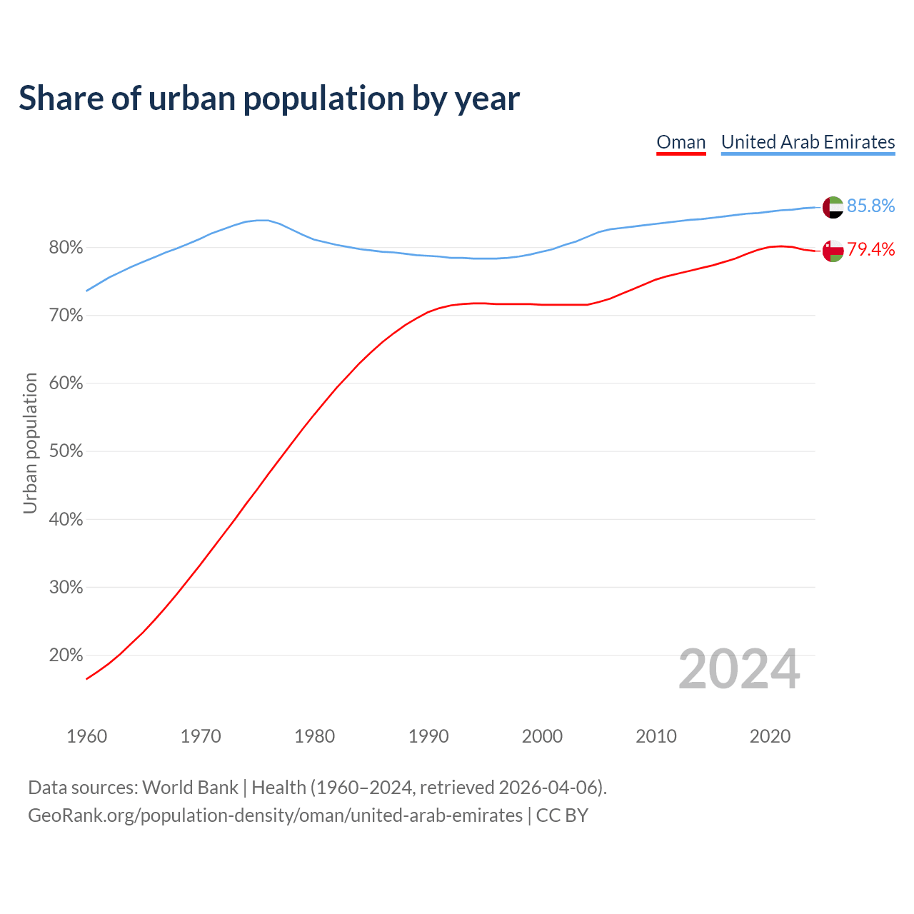 From 2004 to 2024, the share of urban population changed from 71.5% to 79.4% in Oman and from 81.5% to 85.8% in the United Arab Emirates.