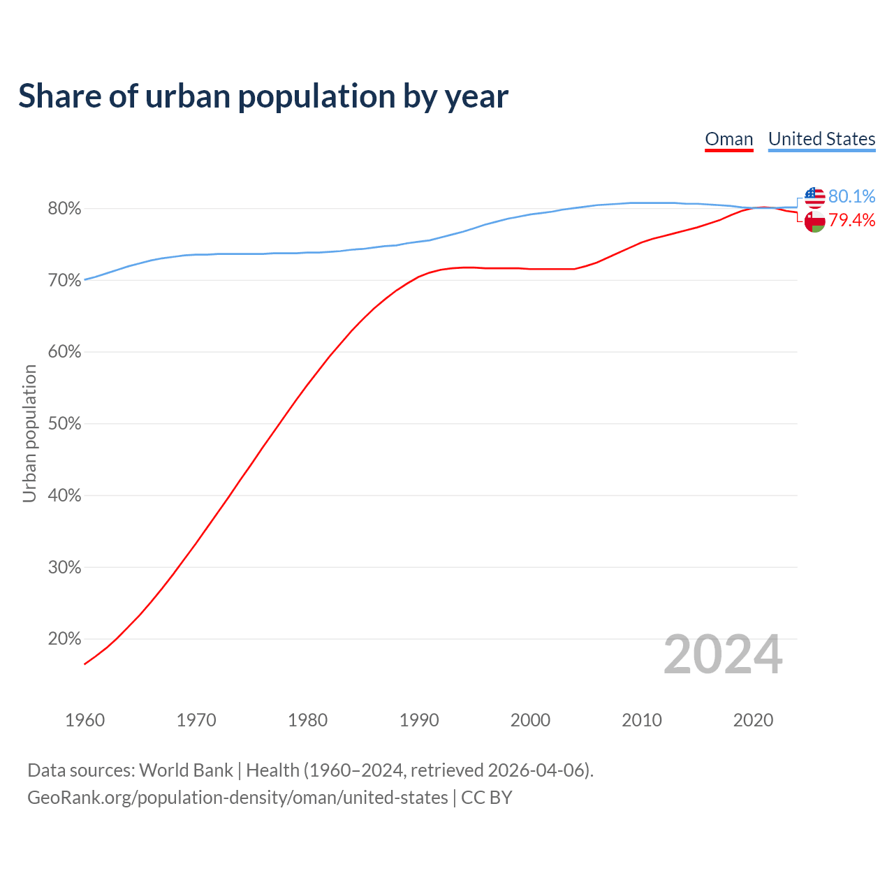 From 2004 to 2024, the share of urban population changed from 71.5% to 79.4% in Oman and from 80% to 80.1% in the United States.