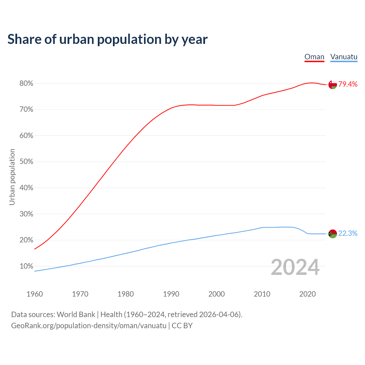 From 2004 to 2024, the share of urban population changed from 71.5% to 79.4% in Oman and from 22.7% to 22.3% in Vanuatu.