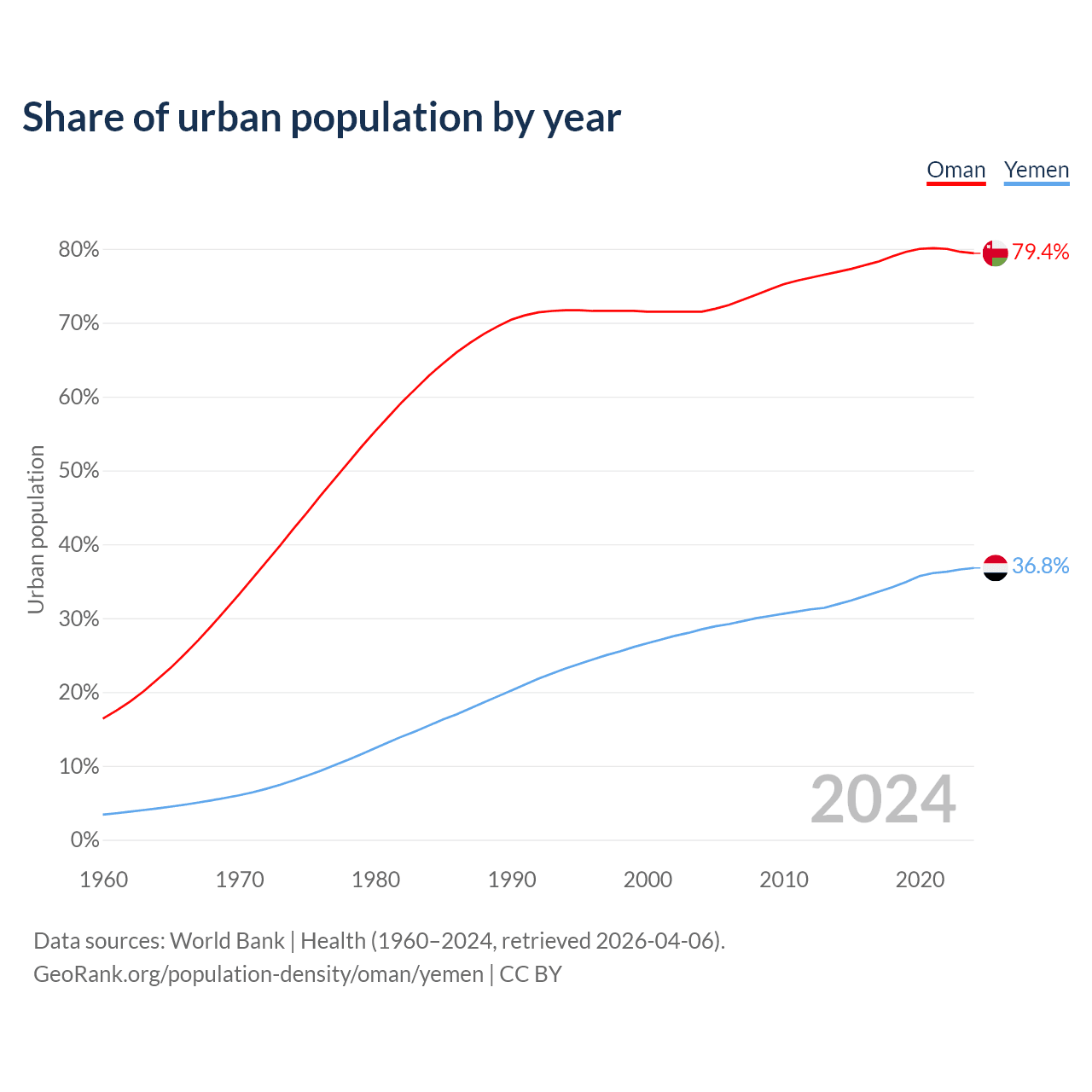 From 2004 to 2024, the share of urban population changed from 71.5% to 79.4% in Oman and from 28.5% to 36.8% in Yemen.
