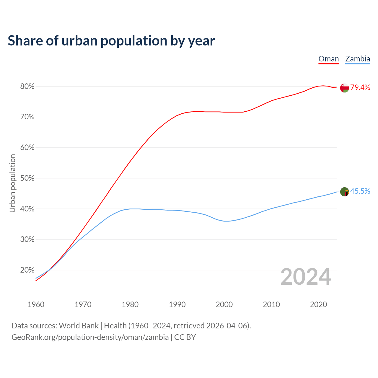 From 2004 to 2024, the share of urban population changed from 71.5% to 79.4% in Oman and from 36.8% to 45.5% in Zambia.