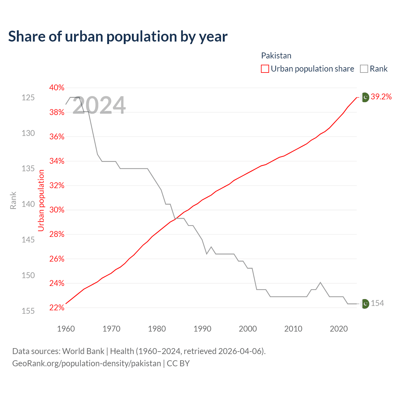 This chart shows the share of urban population in Pakistan from 1960 to 2024: 22.3% lived in urban areas in 1960, 33% in 2000, and 39.2% in 2024.