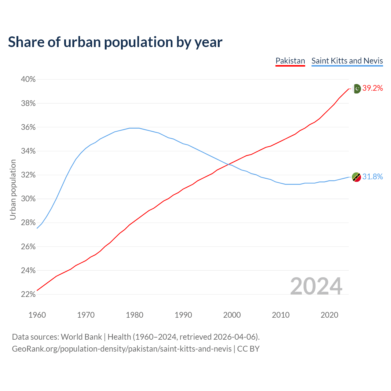 From 2004 to 2024, the share of urban population changed from 33.7% to 39.2% in Pakistan and from 32.1% to 31.8% in Saint Kitts and Nevis.