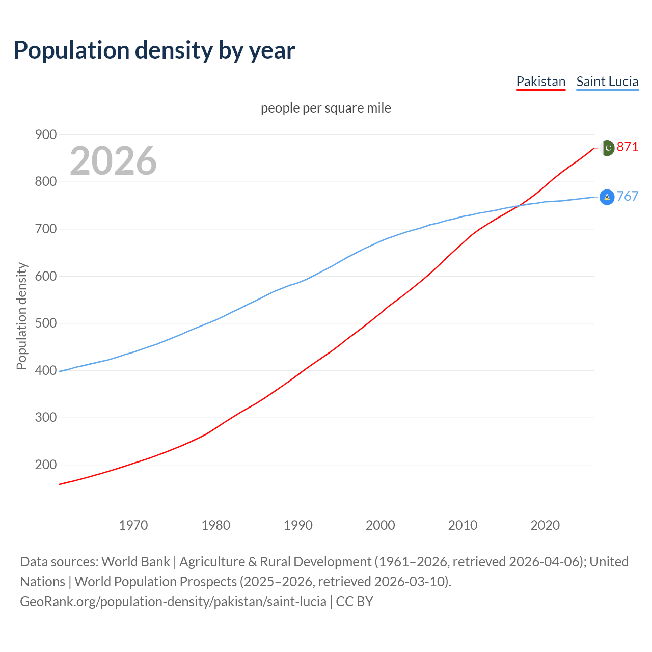 From 2006 to 2026, population density in Pakistan increased by 44.3%, compared to a 8.35% growth in Saint Lucia.