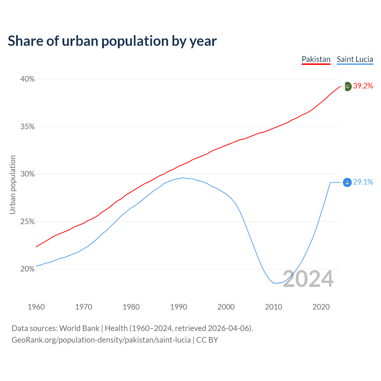 From 2004 to 2024, the share of urban population changed from 33.7% to 39.2% in Pakistan and from 24.8% to 29.1% in Saint Lucia.