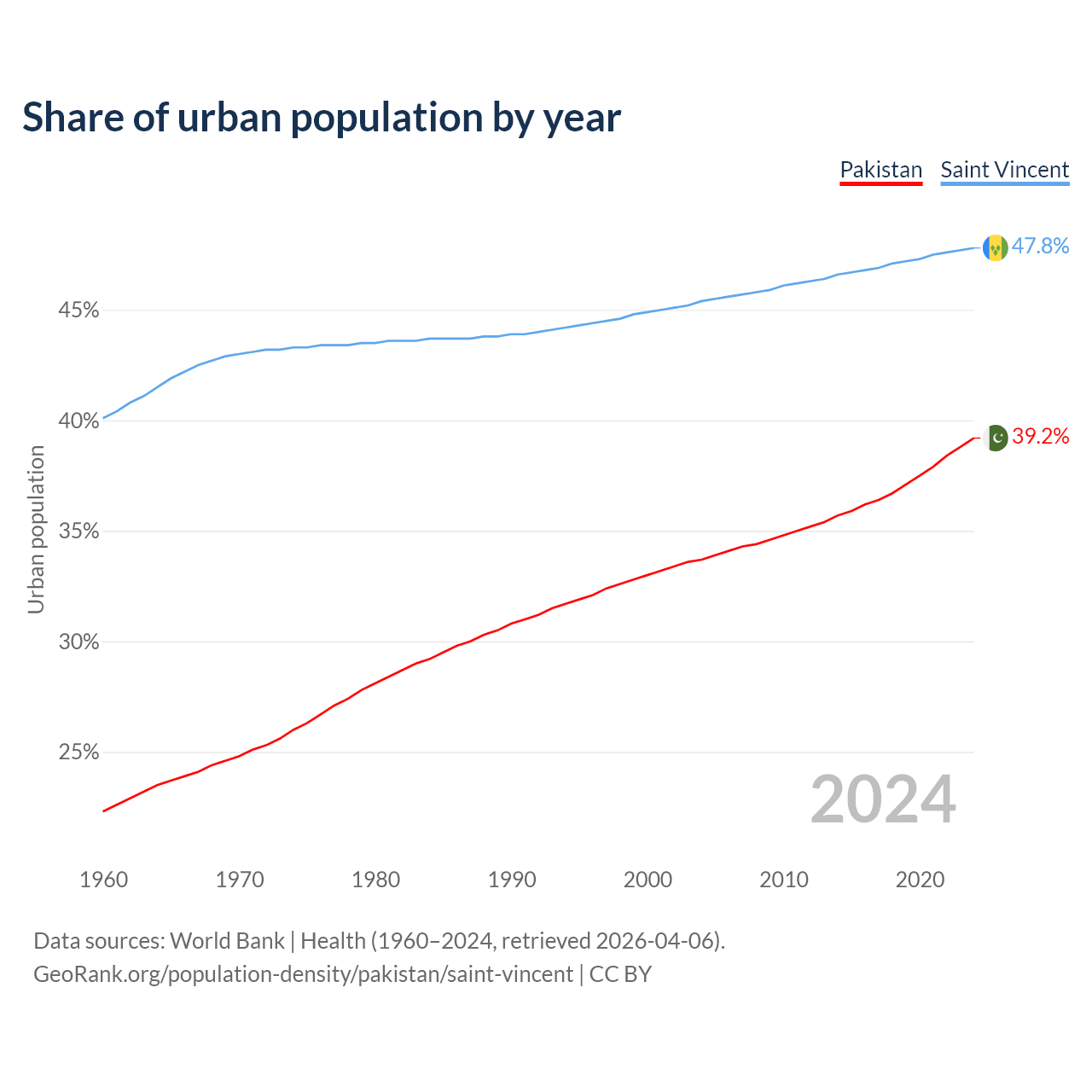 From 2004 to 2024, the share of urban population changed from 33.7% to 39.2% in Pakistan and from 45.4% to 47.8% in Saint Vincent.