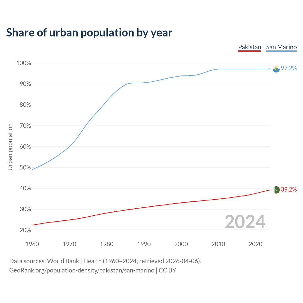 From 2004 to 2024, the share of urban population changed from 33.7% to 39.2% in Pakistan and from 94.2% to 97.2% in San Marino.