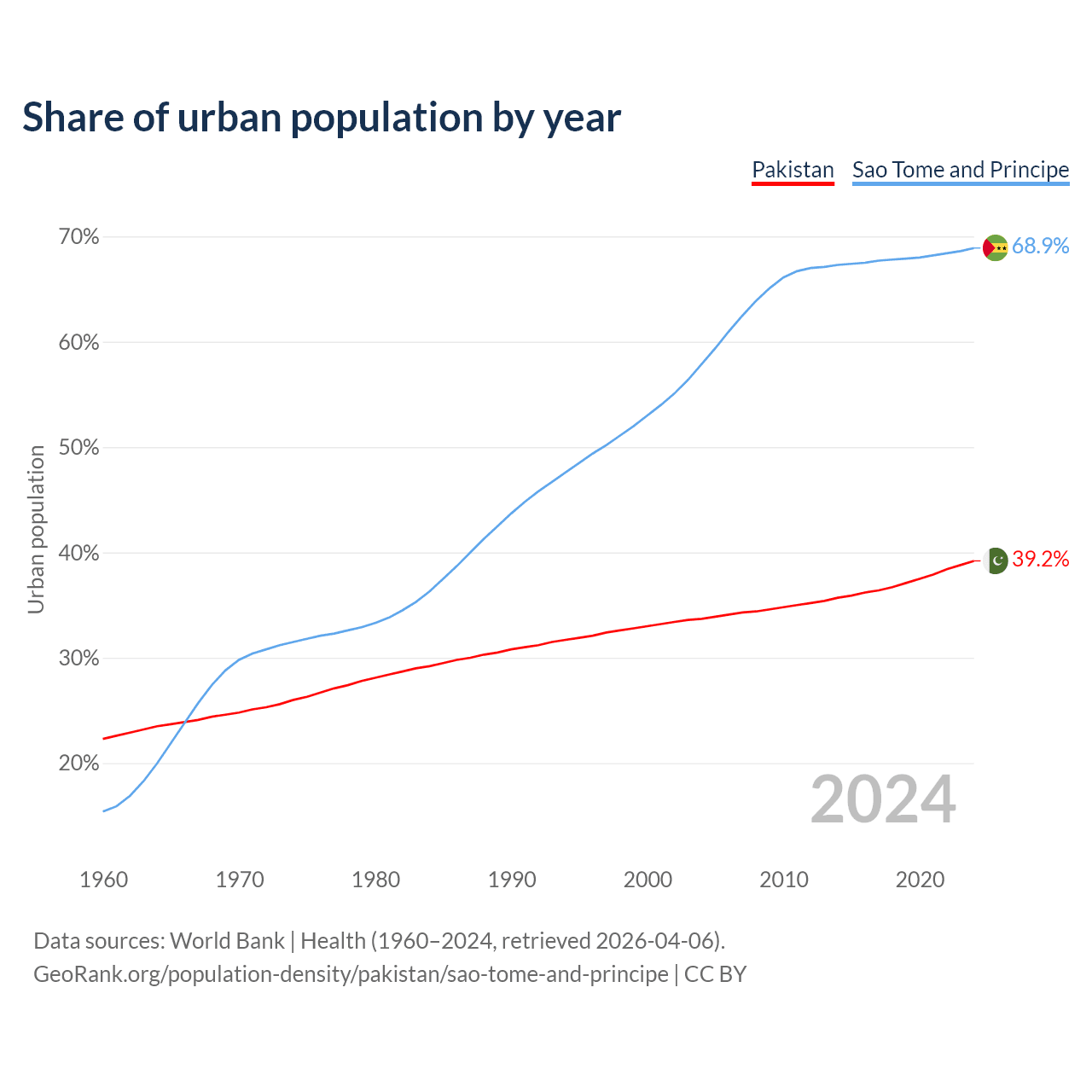 From 2004 to 2024, the share of urban population changed from 33.7% to 39.2% in Pakistan and from 57.9% to 68.9% in Sao Tome and Principe.