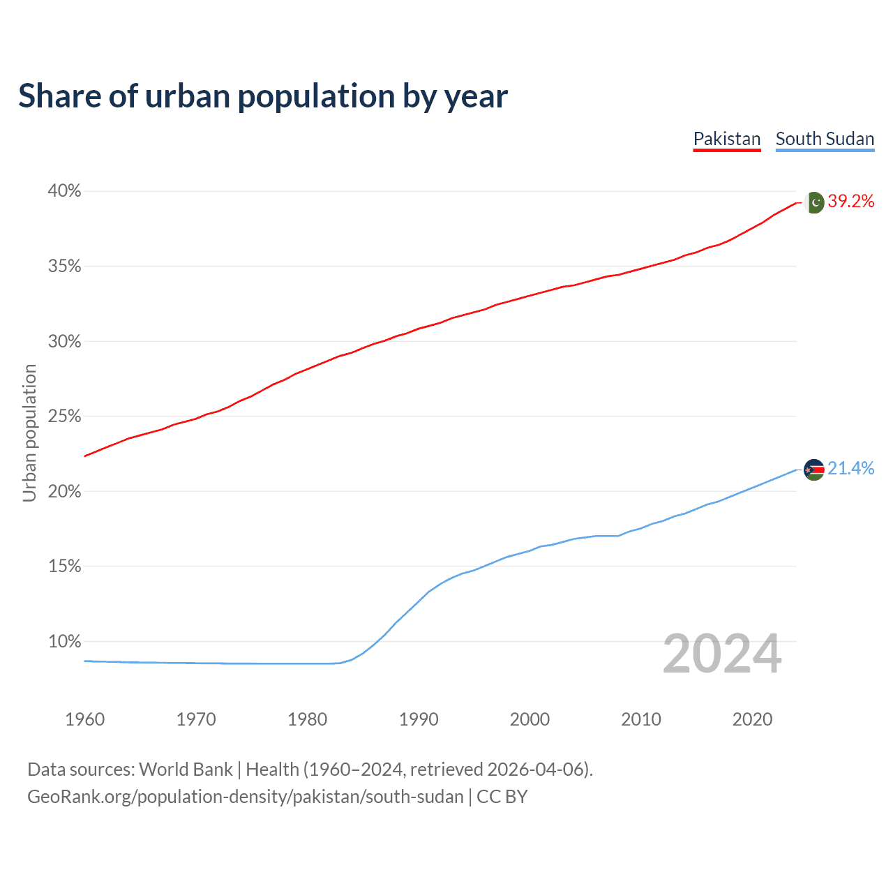 From 2004 to 2024, the share of urban population changed from 33.7% to 39.2% in Pakistan and from 16.8% to 21.4% in South Sudan.