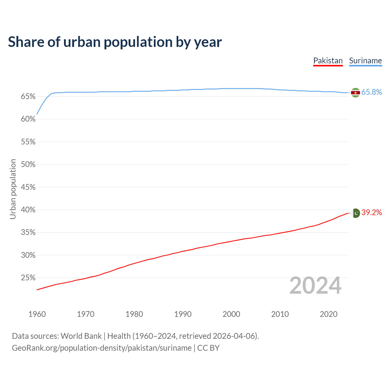 From 2004 to 2024, the share of urban population changed from 33.7% to 39.2% in Pakistan and from 66.7% to 65.8% in Suriname.