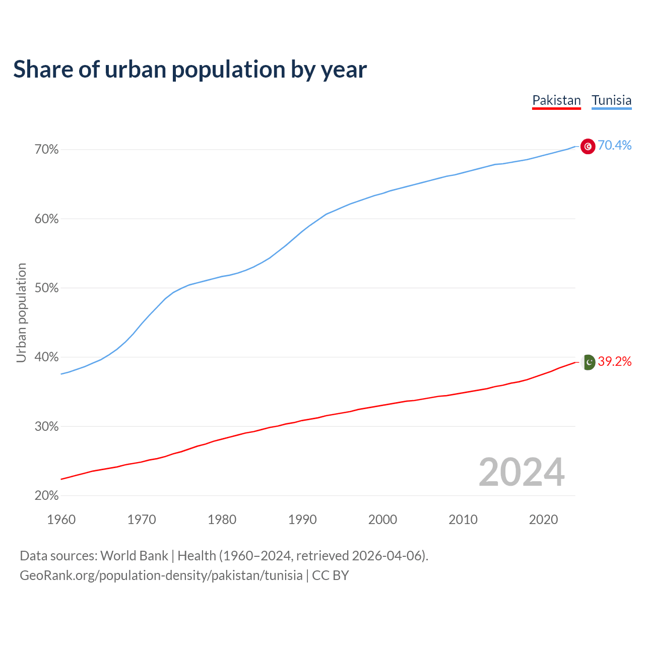 From 2004 to 2024, the share of urban population changed from 33.7% to 39.2% in Pakistan and from 64.9% to 70.4% in Tunisia.