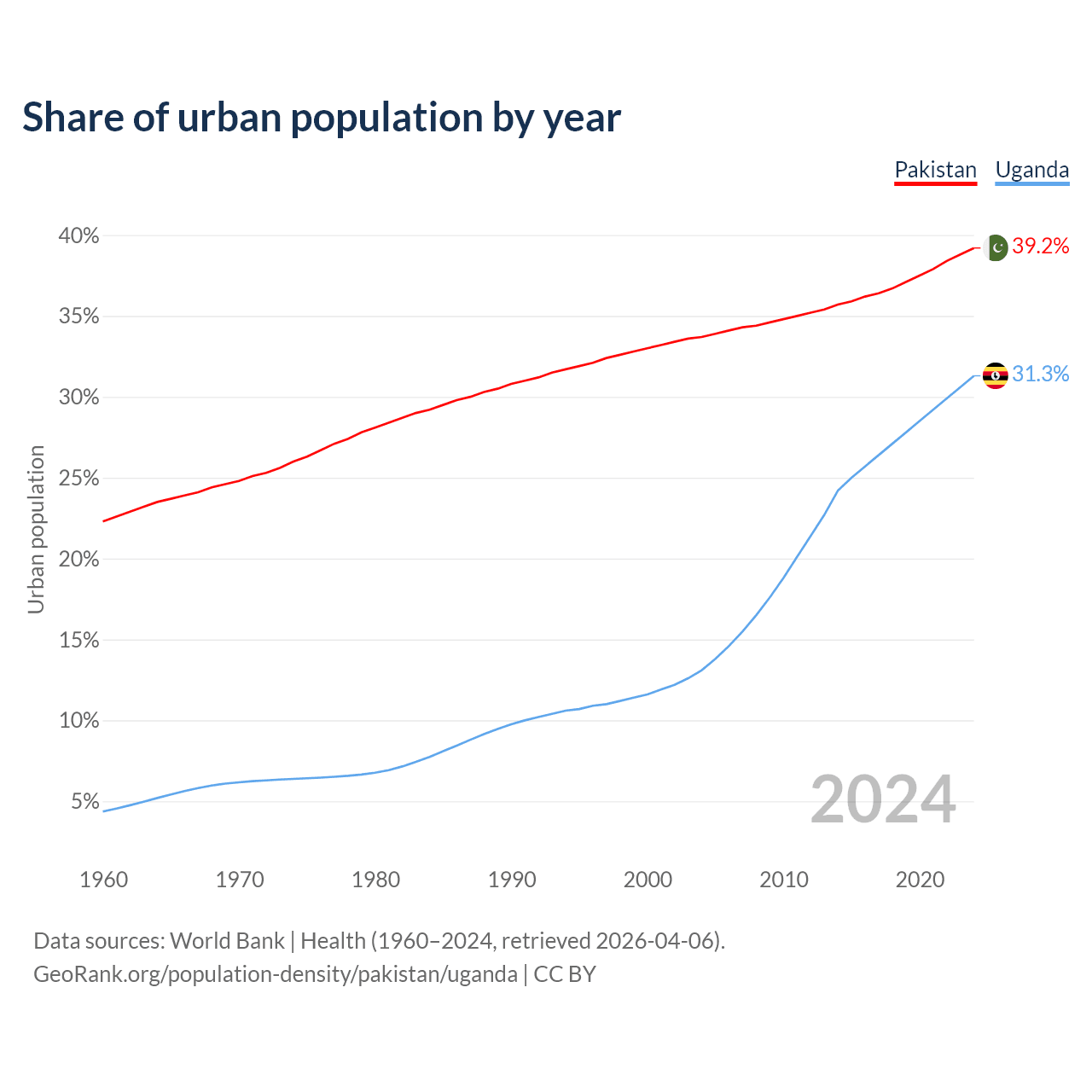 From 2004 to 2024, the share of urban population changed from 33.7% to 39.2% in Pakistan and from 13.1% to 31.3% in Uganda.