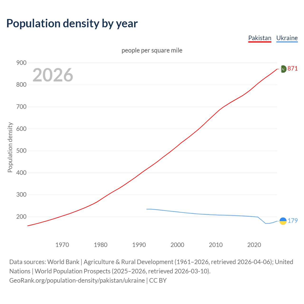 From 2006 to 2026, population density in Pakistan increased by 44.3%, compared to a 15.1% decline in Ukraine.