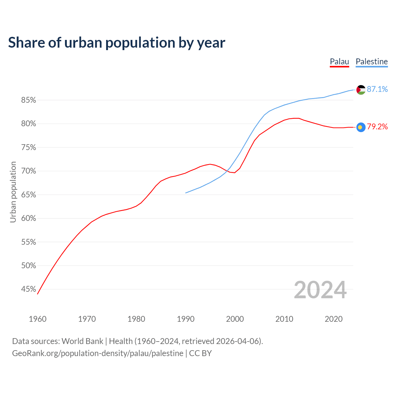 From 2004 to 2024, the share of urban population changed from 76.4% to 79.2% in Palau and from 79% to 87.1% in Palestine.