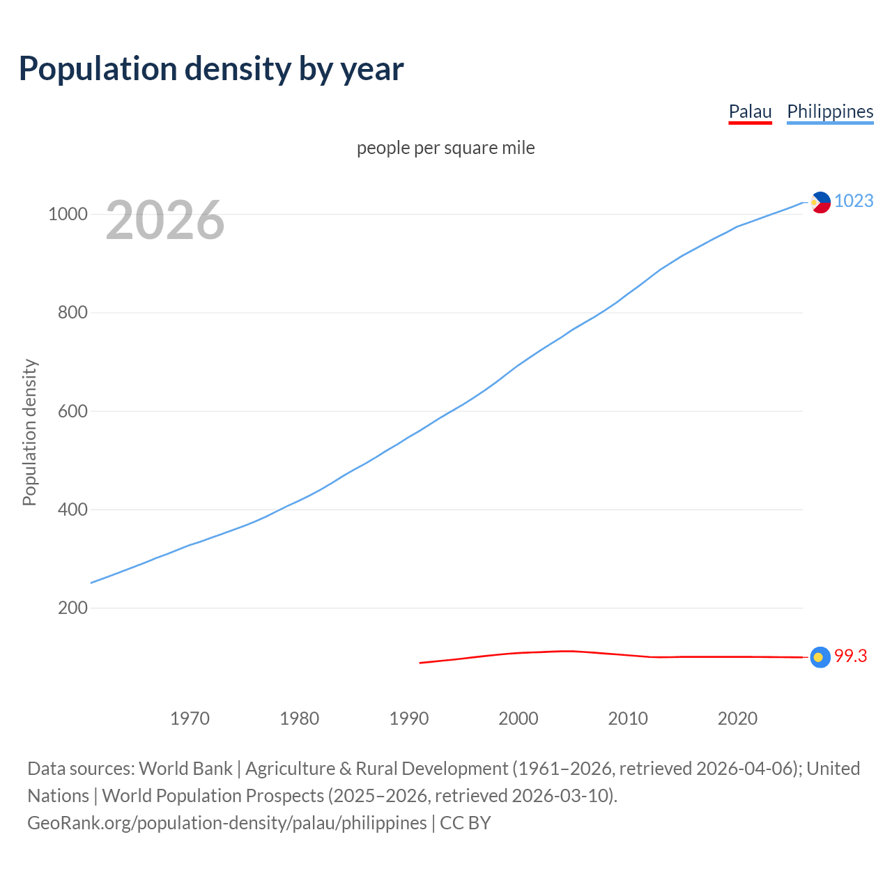 From 2006 to 2026, population density in Palau decreased by 10%, compared to a 31.5% growth in the Philippines.