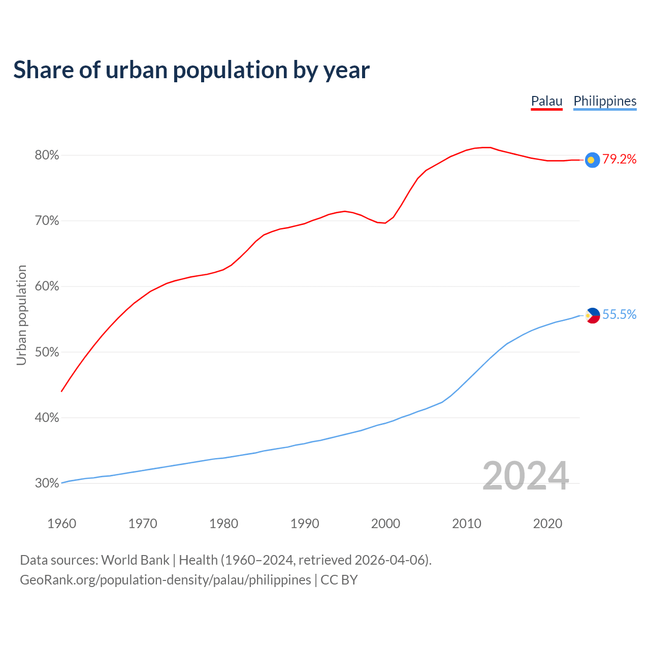 From 2004 to 2024, the share of urban population changed from 76.4% to 79.2% in Palau and from 40.9% to 55.5% in the Philippines.