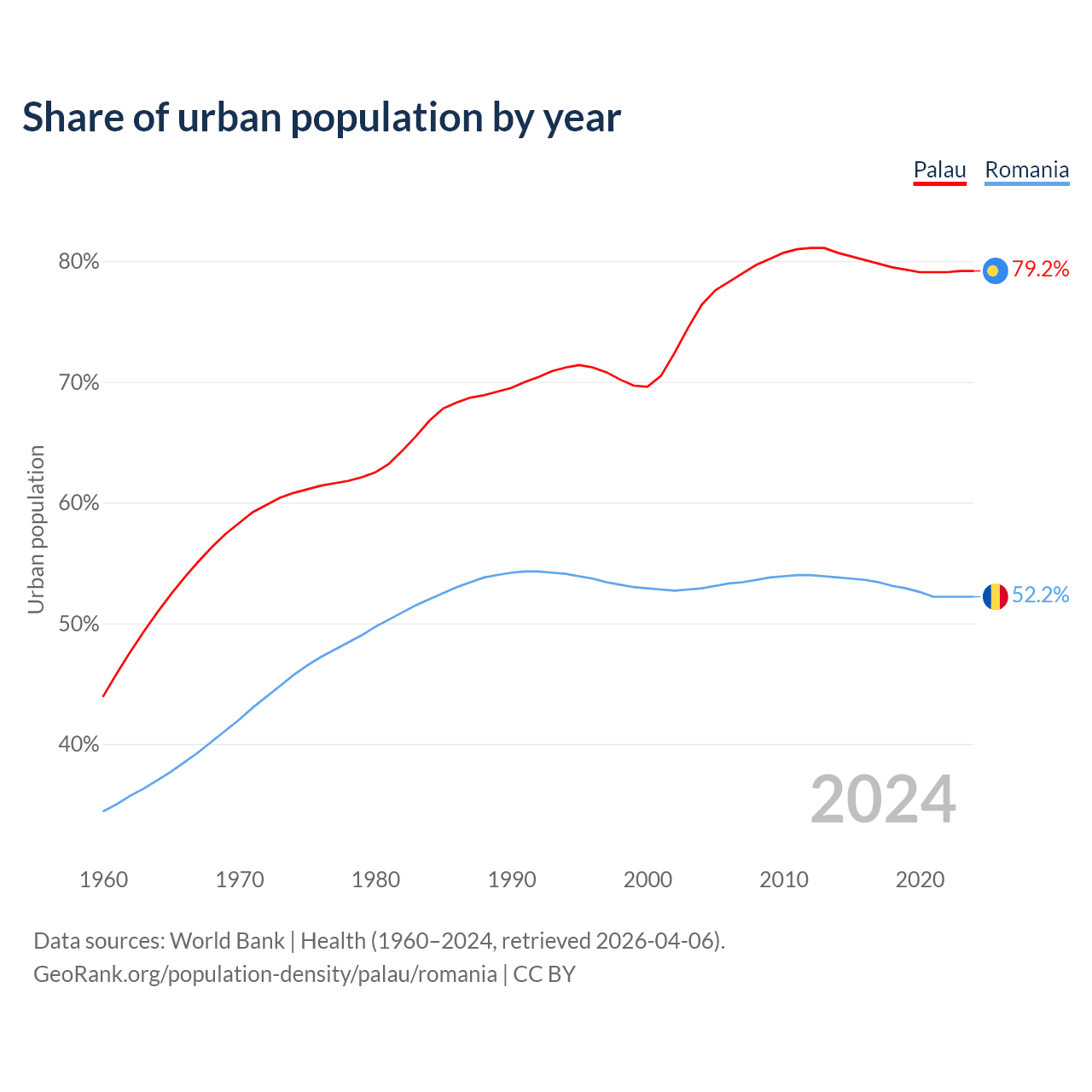 From 2004 to 2024, the share of urban population changed from 76.4% to 79.2% in Palau and from 52.9% to 52.2% in Romania.