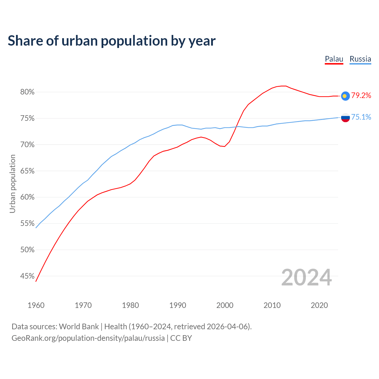 From 2004 to 2024, the share of urban population changed from 76.4% to 79.2% in Palau and from 73.3% to 75.1% in Russia.