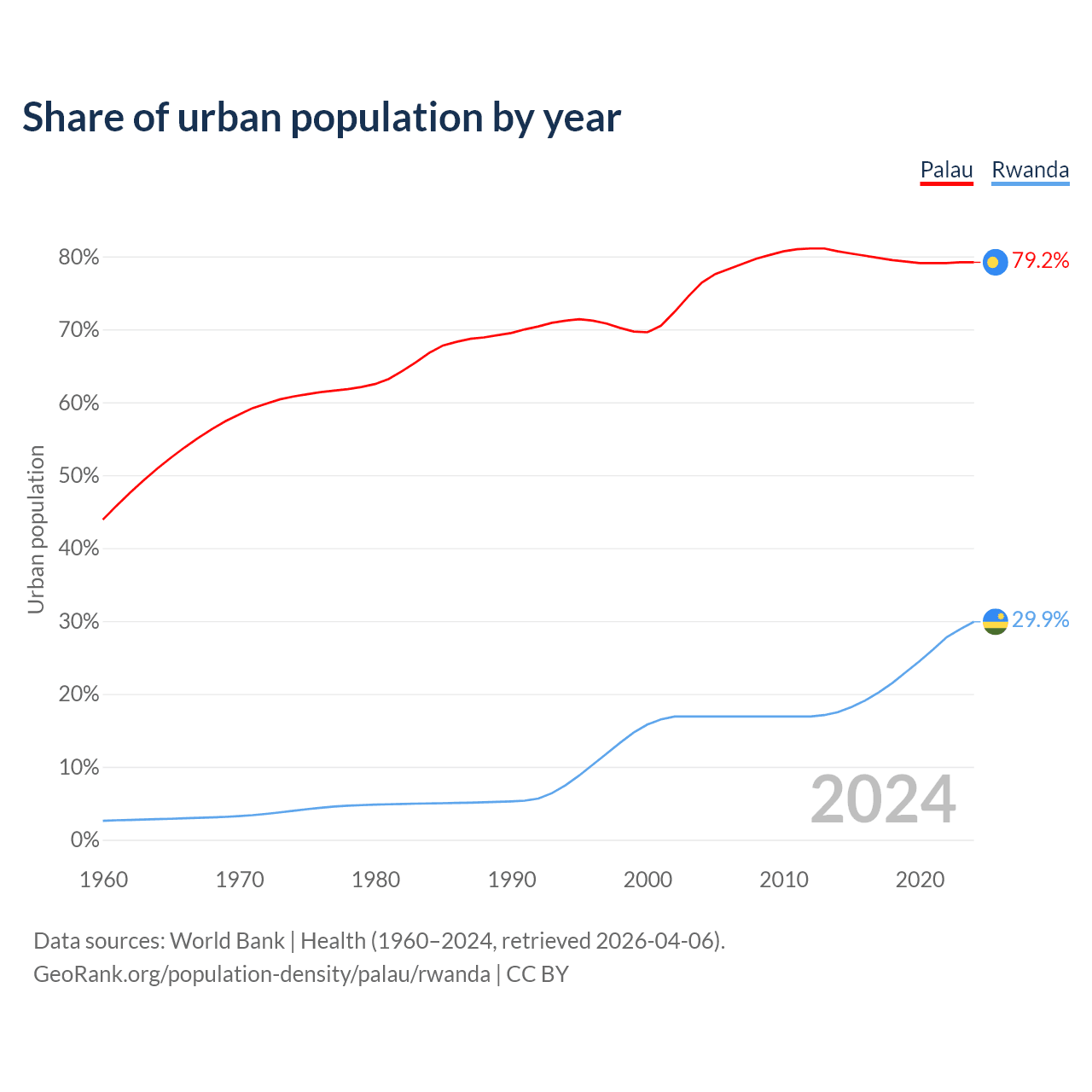 From 2004 to 2024, the share of urban population changed from 76.4% to 79.2% in Palau and from 16.9% to 29.9% in Rwanda.