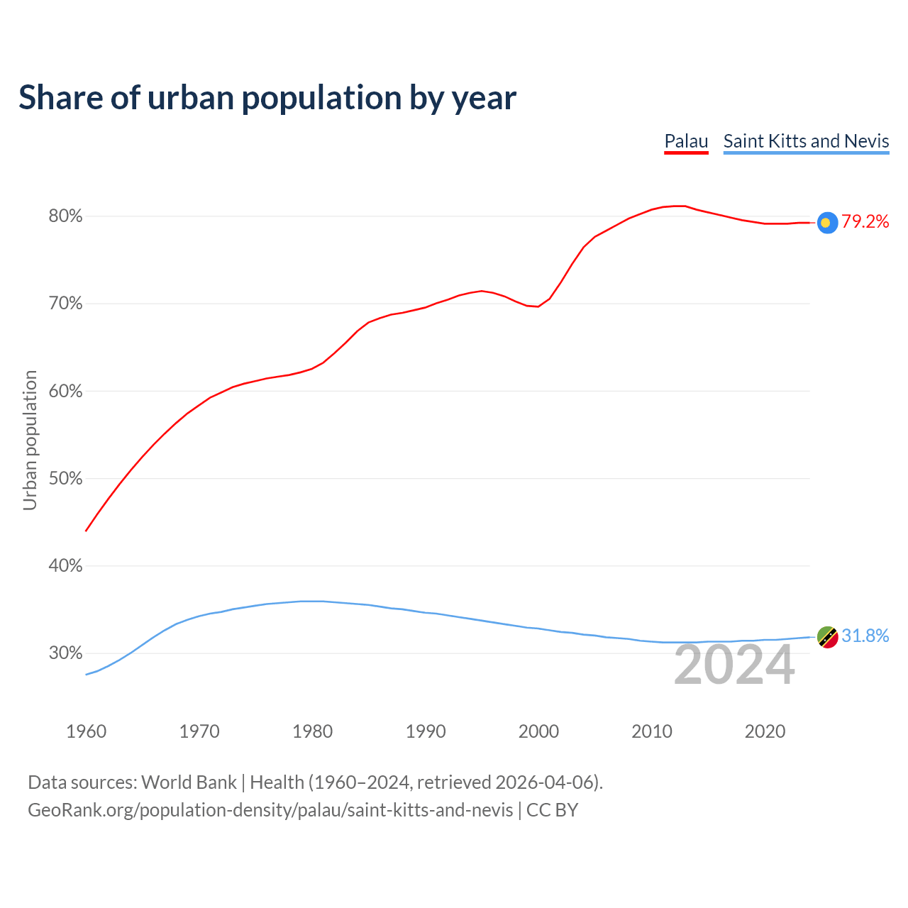 From 2004 to 2024, the share of urban population changed from 76.4% to 79.2% in Palau and from 32.1% to 31.8% in Saint Kitts and Nevis.
