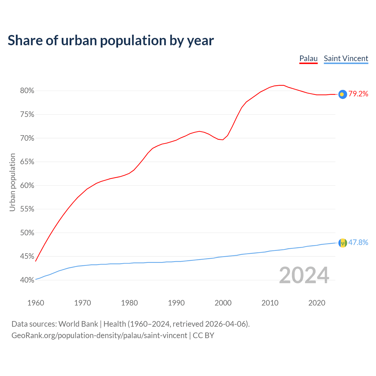From 2004 to 2024, the share of urban population changed from 76.4% to 79.2% in Palau and from 45.4% to 47.8% in Saint Vincent.