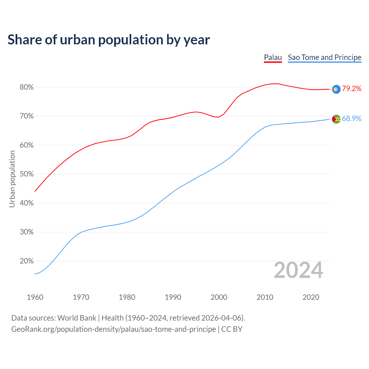 From 2004 to 2024, the share of urban population changed from 76.4% to 79.2% in Palau and from 57.9% to 68.9% in Sao Tome and Principe.