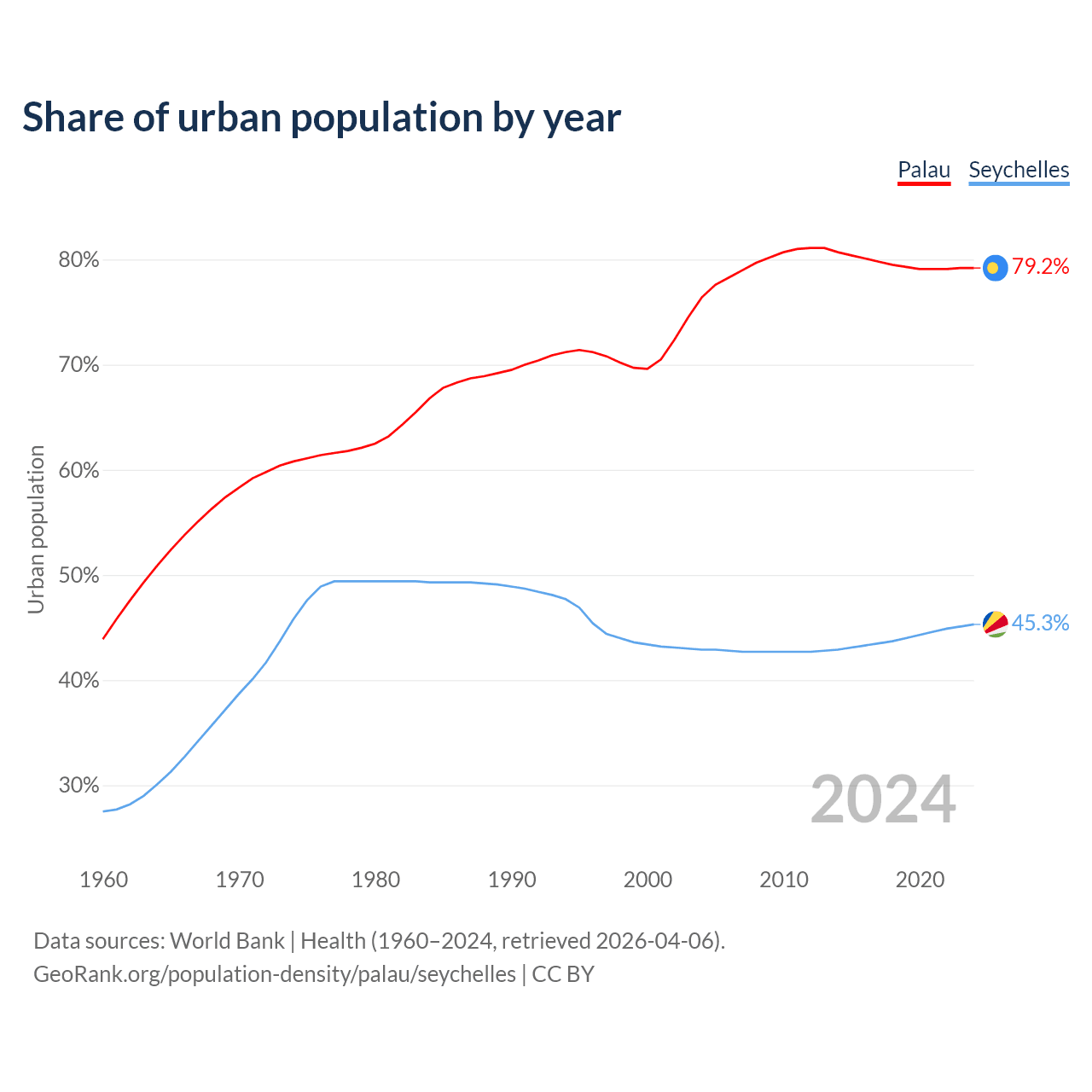 From 2004 to 2024, the share of urban population changed from 76.4% to 79.2% in Palau and from 42.9% to 45.3% in the Seychelles.