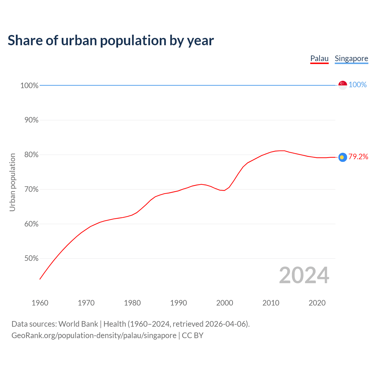 From 2004 to 2024, the share of urban population changed from 76.4% to 79.2% in Palau and from 100% to 100% in Singapore.