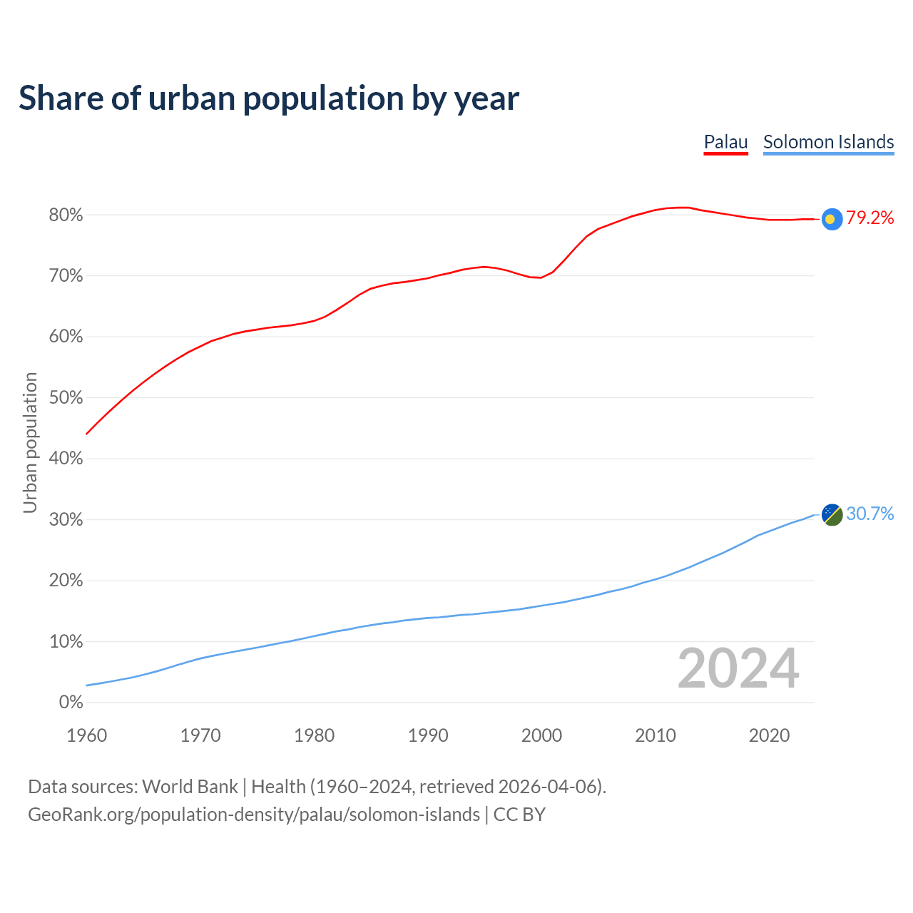 From 2004 to 2024, the share of urban population changed from 76.4% to 79.2% in Palau and from 17.2% to 30.7% in the Solomon Islands.