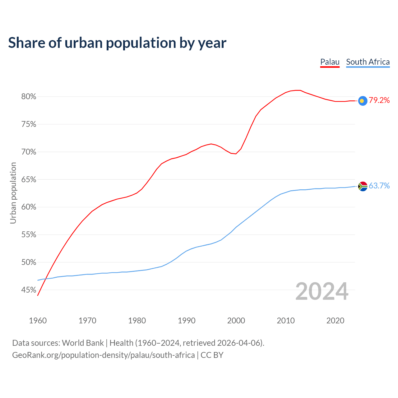 From 2004 to 2024, the share of urban population changed from 76.4% to 79.2% in Palau and from 59.1% to 63.7% in South Africa.