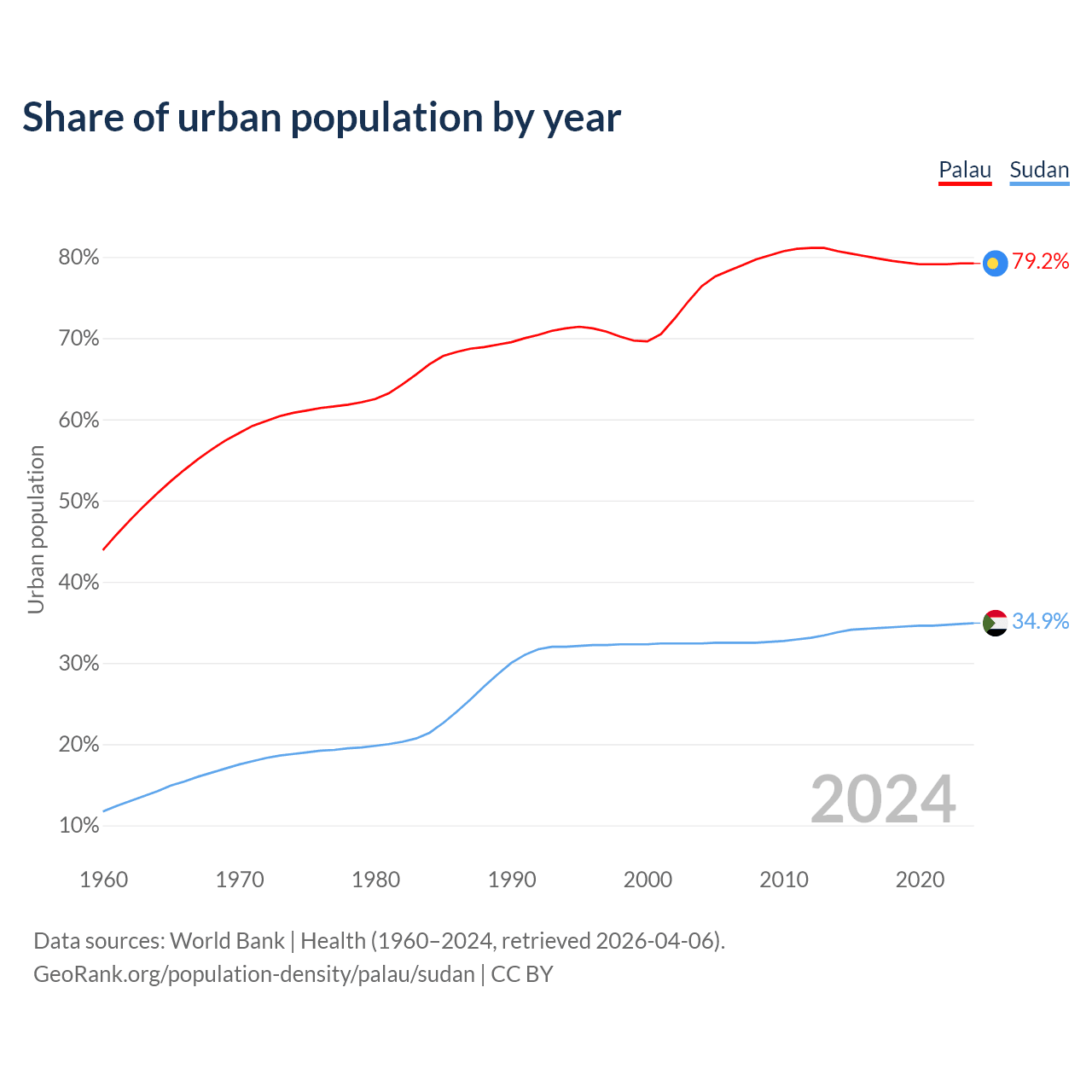 From 2004 to 2024, the share of urban population changed from 76.4% to 79.2% in Palau and from 32.4% to 34.9% in Sudan.