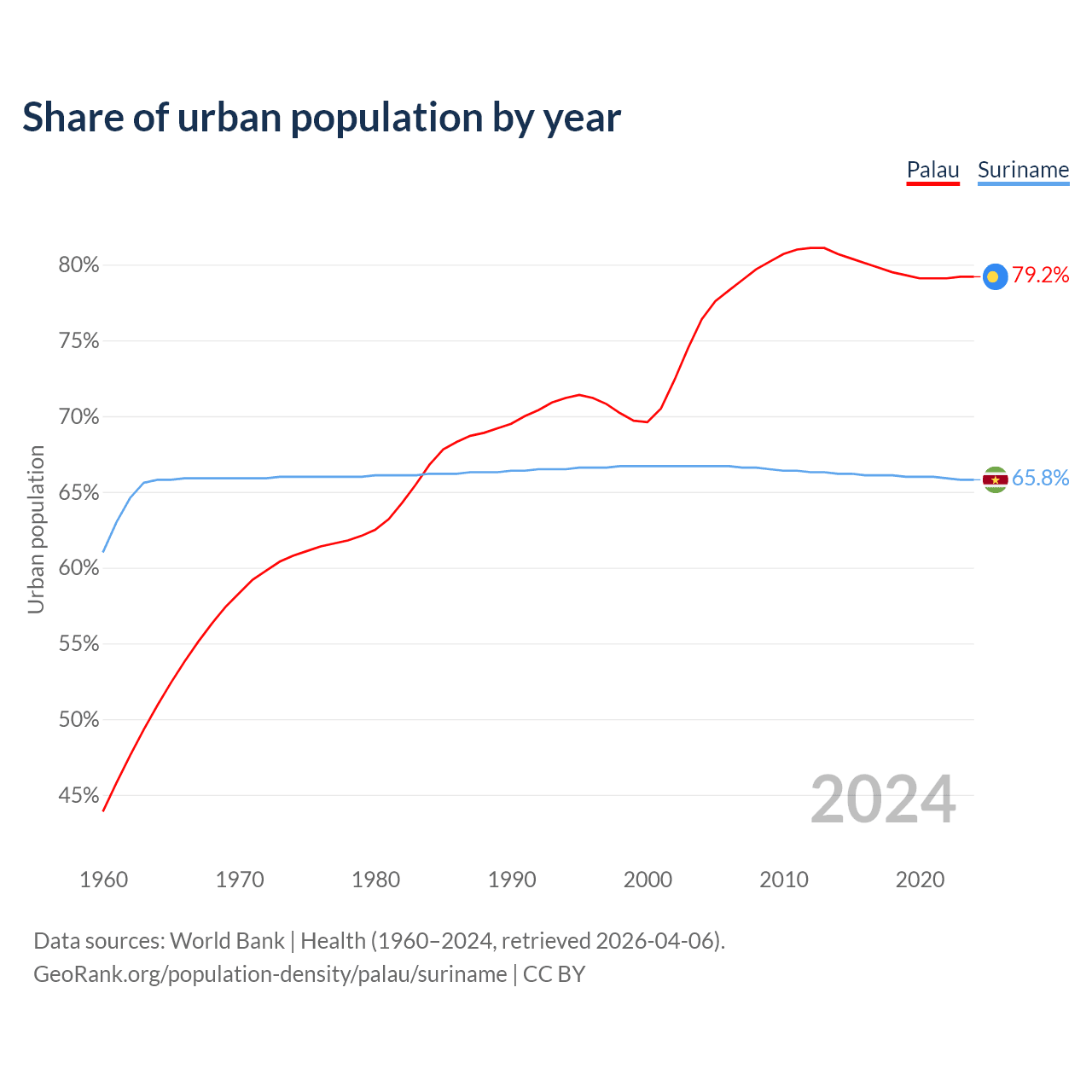 From 2004 to 2024, the share of urban population changed from 76.4% to 79.2% in Palau and from 66.7% to 65.8% in Suriname.