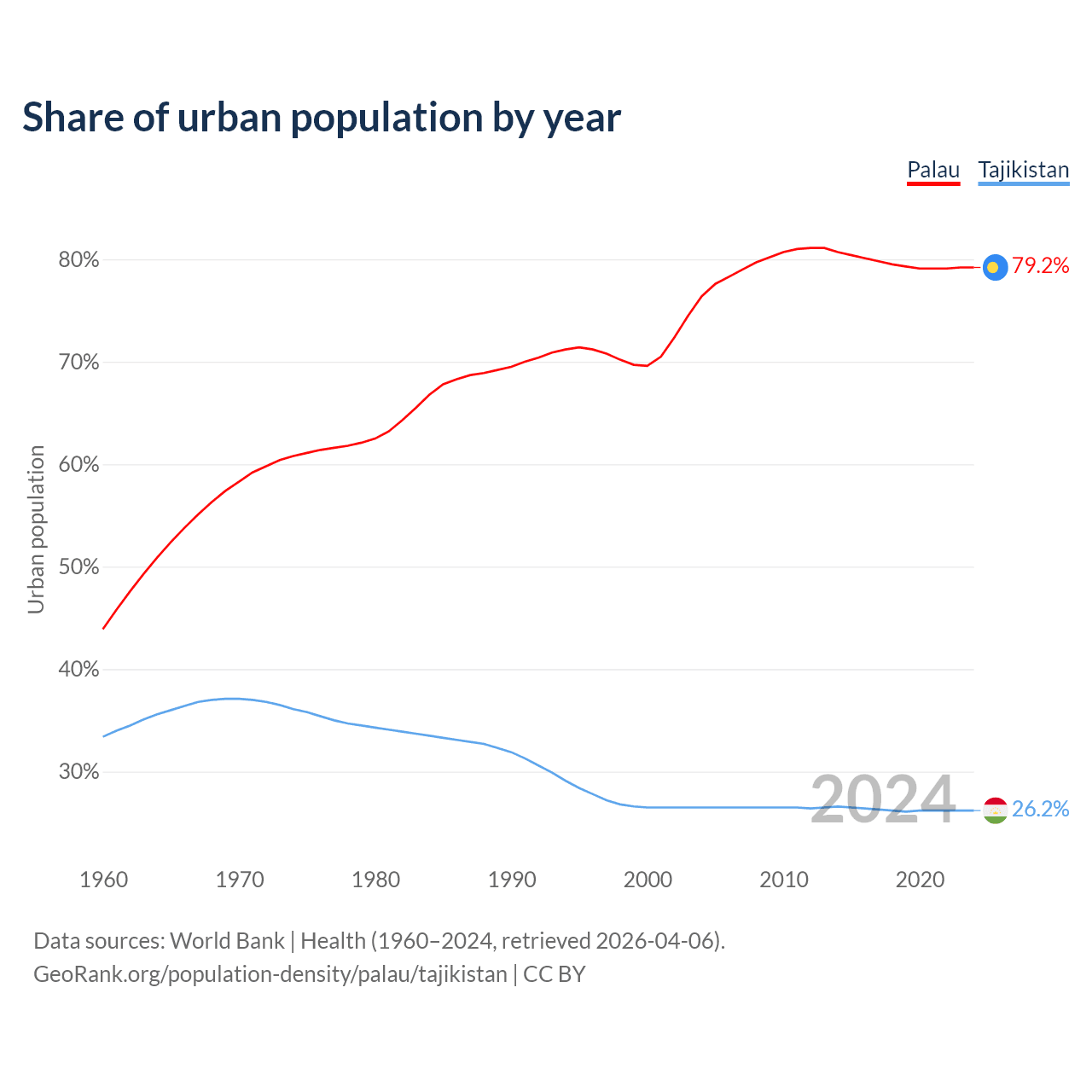 From 2004 to 2024, the share of urban population changed from 76.4% to 79.2% in Palau and from 26.5% to 26.2% in Tajikistan.