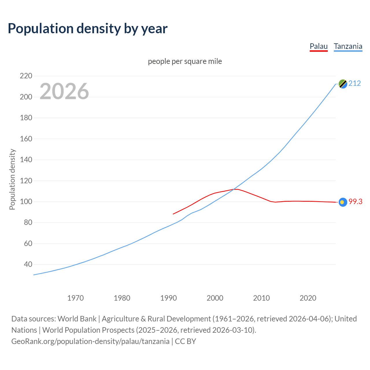 From 2006 to 2026, population density in Palau decreased by 10%, compared to a 80.1% growth in Tanzania.