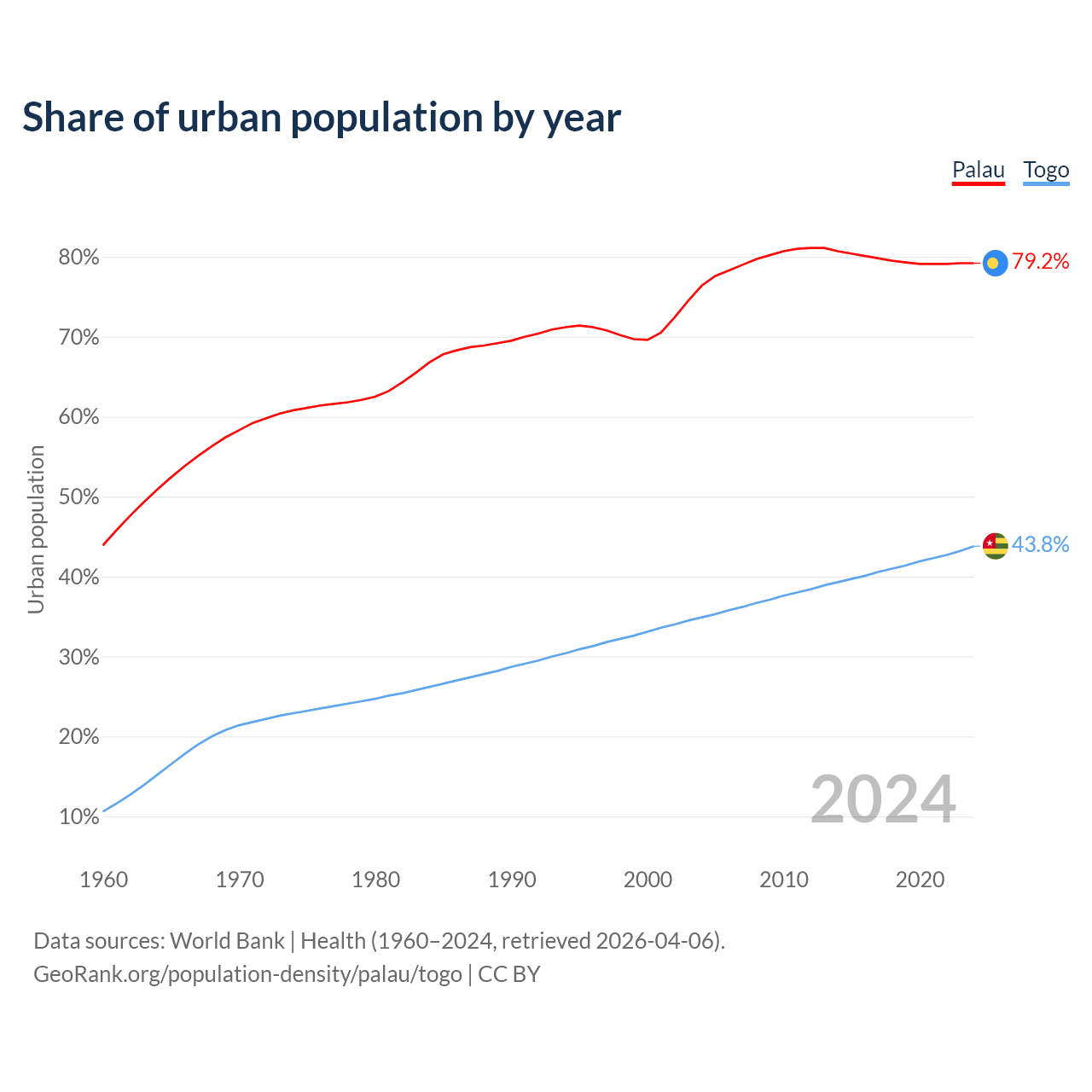 From 2004 to 2024, the share of urban population changed from 76.4% to 79.2% in Palau and from 34.9% to 43.8% in Togo.