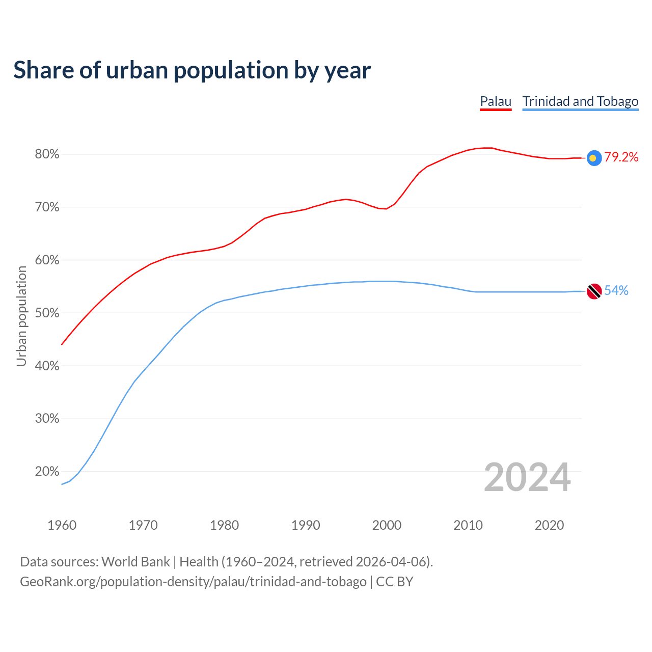 From 2004 to 2024, the share of urban population changed from 76.4% to 79.2% in Palau and from 55.6% to 54% in Trinidad and Tobago.